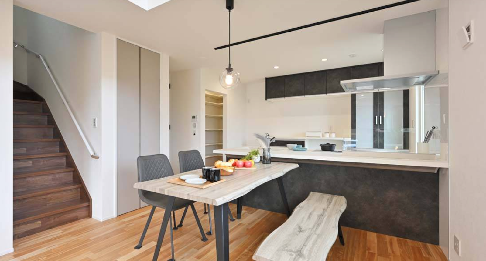 このLDKの最大の特徴は、天井まで抜ける吹き抜け。高い位置から差し込む自然光が室内全体を明るく照らし、時間帯によって変化する光の表情も楽しめます。開放感が生まれることで、実際の広さ以上にゆとりを感じられるのも魅力。さらに床にはあたたかみのある無垢材を採用。木の質感やぬくもりが、家族がリラックスして過ごせる心地よさを演出し、自然とリビングが「集まる場所」に。