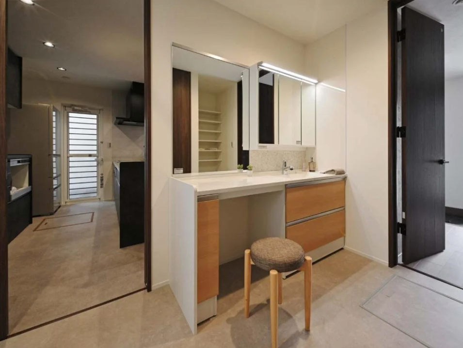 共働きということもあり、家事のしやすさを重視し、回遊できる動線に設計。洗面脱衣室にはサニタリールーム機能を持たせ、洗濯機からキッチンへすぐに行ける動線を意識したことで、日々の家事負担が軽減。また収納面にもこだわり、洗面脱衣室にはタオルや日用品を整理できる収納を確保。