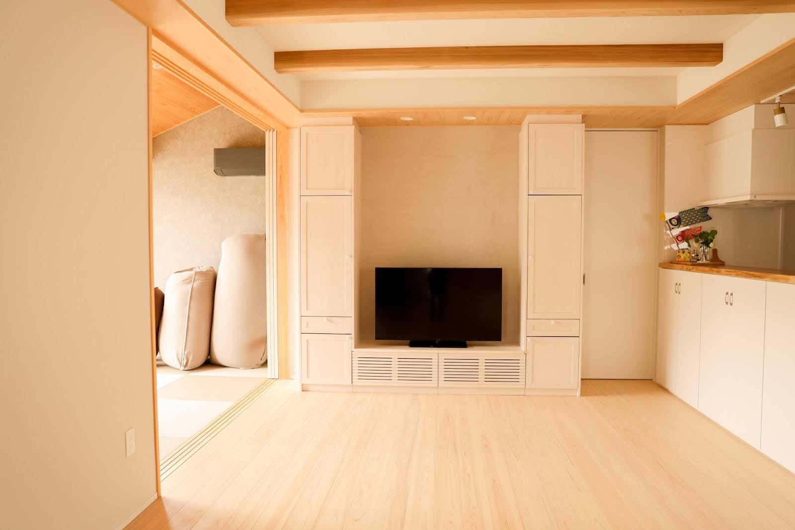 家族が集まる場所だから、足触りの良い杉やパインの無垢床に。壁は消臭効果のある珪藻土で空気をきれいに。