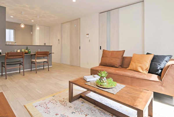 ショールームのように洗練された雰囲気が魅力のLDK。リビングにはペット用の収納や子どものおもちゃスペースを設けたので、いつでも片づいた状態を保てるのが◎。キッチンの床にはフロアタイルを採用。傷や油汚れ、水にも強いので安心して使えて、料理の時間がより快適に。さらに、リビングの天井は突板の天井材に、テレビ裏にはエコカラットを採用。デザイン性だけでなく調湿・消臭効果もあり、居心地の良い空間になっています。