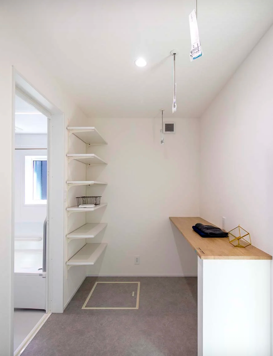 白を基調としたシンプルなランドリースペース。壁面の可動棚や木のカウンターが、収納と作業のしやすさを両立しています。洗濯後の「干す・たたむ・しまう」が一か所で完結する、家事効率の高い設計。清潔感と温もりを感じるデザインで、毎日の家事が少し楽しみになる空間です。