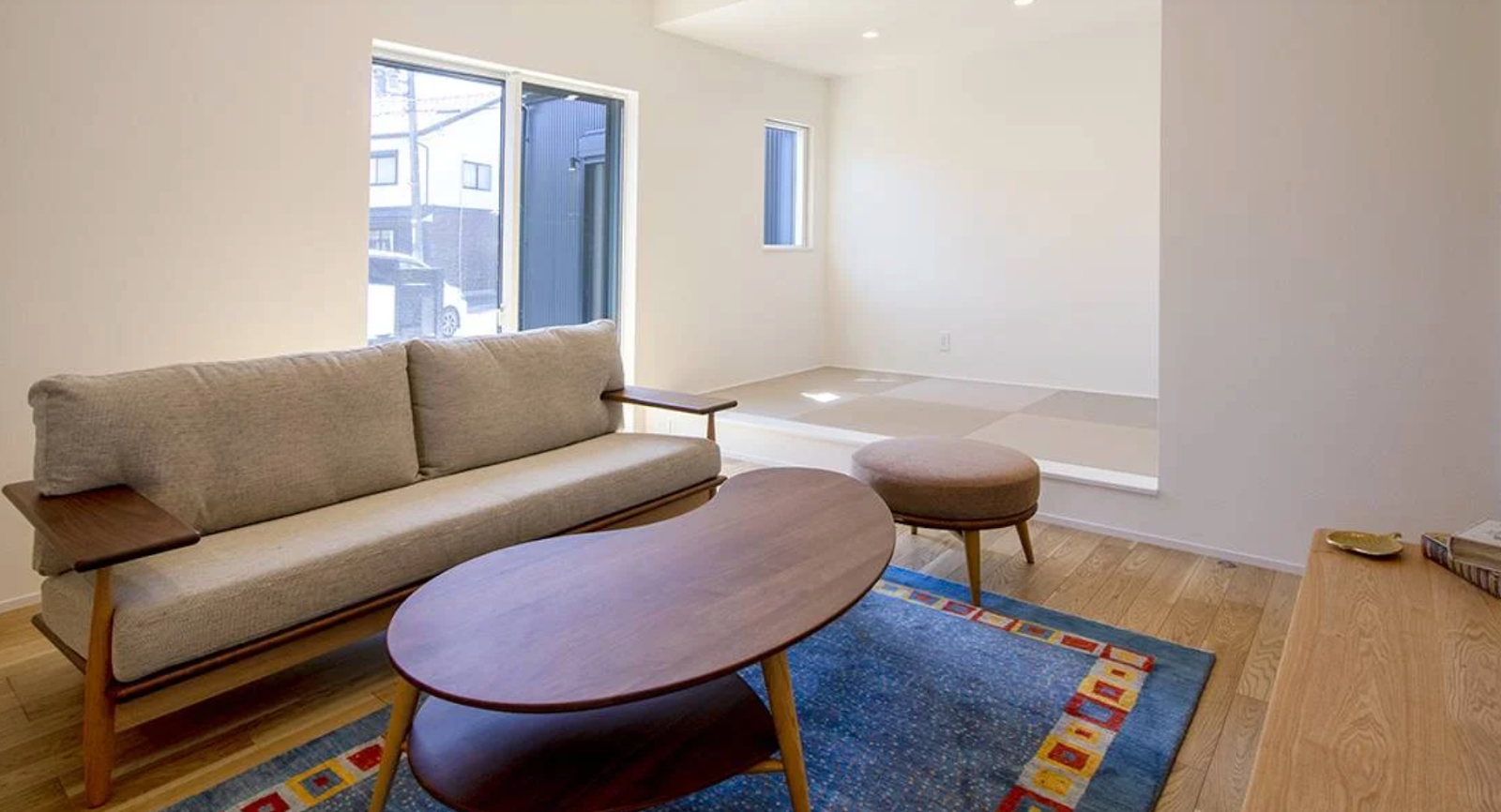木目調×白基調のシンプルで温かみのあるリビング。奥には一段高くなった小上がりの和室スペースがあり、読書や昼寝、お子様の遊び場等、様々な用途で楽しめそう。大きな窓からは自然光が差し込み、白い壁とナチュラルウッドの組み合わせが、明るく開放的で落ち着いた雰囲気を作り出します。北欧テイストと和の要素が調和した、シンプルモダンなインテリア空間です。