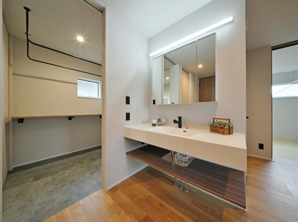 吹き抜けのある畳スペースを抜けると、オープンタイプの洗面スペース。奥には、ランドリールームがあり、アイアンバーとカウンターを設けて、「干す→畳む」の作業が無駄なく行える時短アイデアを採用。天候を気にしなくても良いので、忙しい子育て世代には、ぜひまねして欲しいアイデアだ。