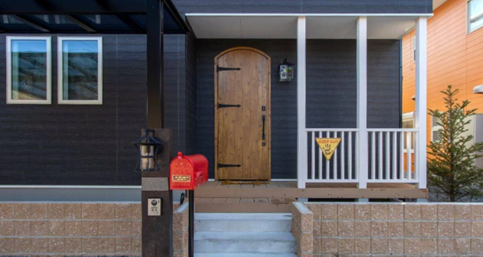 黒を基調とした外観に、温かみのある木製のアーチ型玄関ドアが映える住宅のエントランス。赤いポストとクラシカルな照明がアクセントとなり、落ち着いた雰囲気の中にも遊び心をプラス。白い手すりのポーチやレンガ調のアプローチが全体の調和を生み、個性的でありながら上品な佇まいを演出しました。
