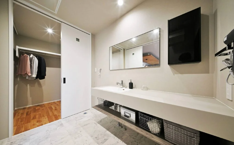 収納便利なファミリークローゼット。洗面脱衣室とファミリークローゼットが隣接していて通り抜けができるため、バスタオルや着替えなど収納するのに便利です。洗濯機との距離も近いので洗濯できたものをすぐに収納できるので時短にもなります。
