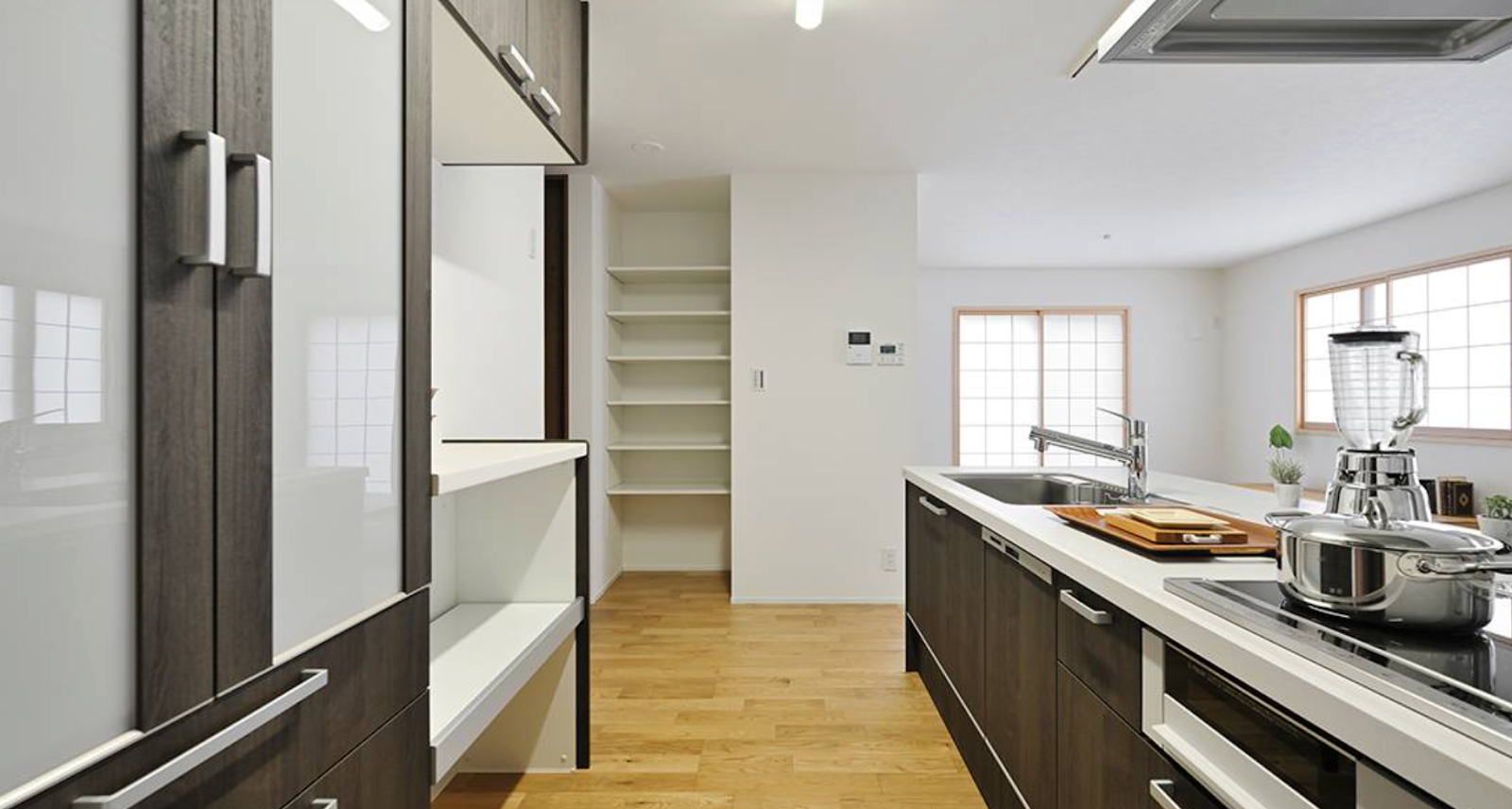 モダンで落ち着いた木目調のデザインが目を引く、機能美にあふれたキッチン空間。作業動線が考慮されたアイランドキッチンは開放感があり、奥には大容量のパントリーも完備。白を基調とした壁と温かみのあるフローリングが、家族との時間をより豊かに演出する洗練された住まい。