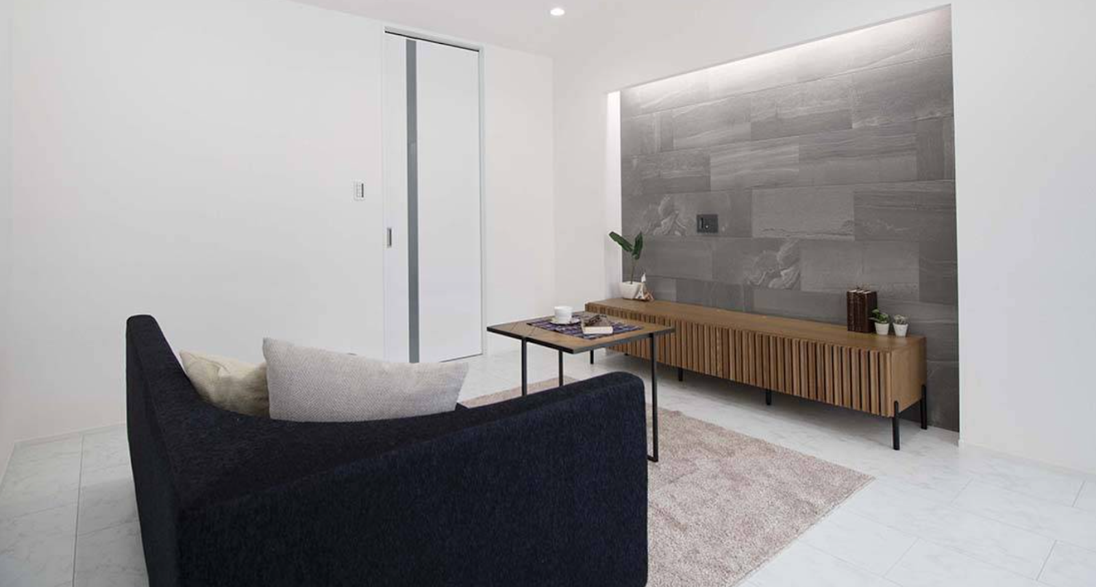 ホワイトを基調としたクリーンな空間に、石目調のグレータイルが圧倒的な存在感を放つリビングの実例です。壁一面に施されたアクセントウォールは、間接照明の柔らかな光を受けることで豊かな陰影を生み出し、夜にはより一層ラグジュアリーな雰囲気を醸し出します。