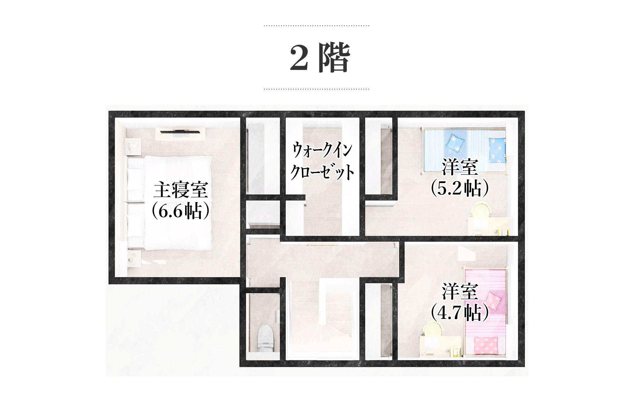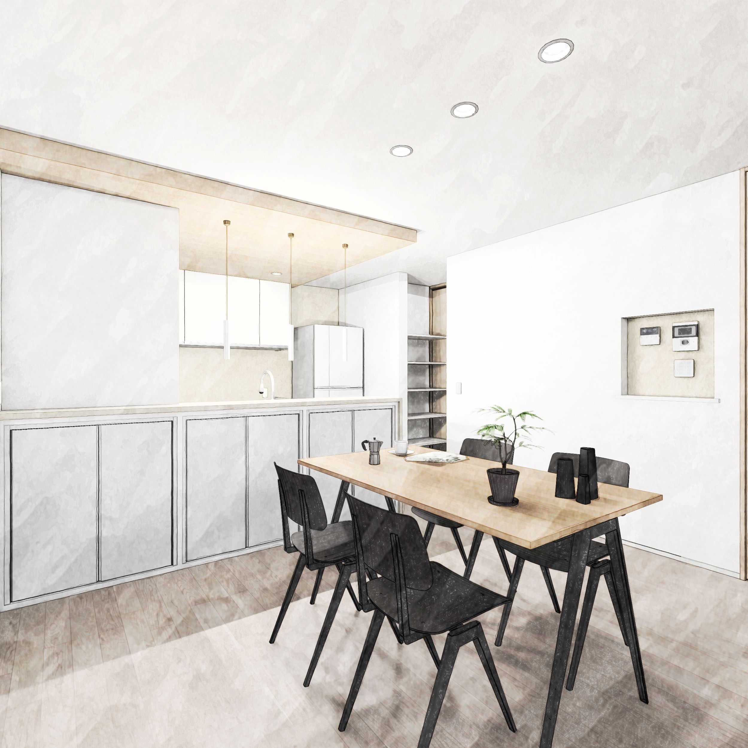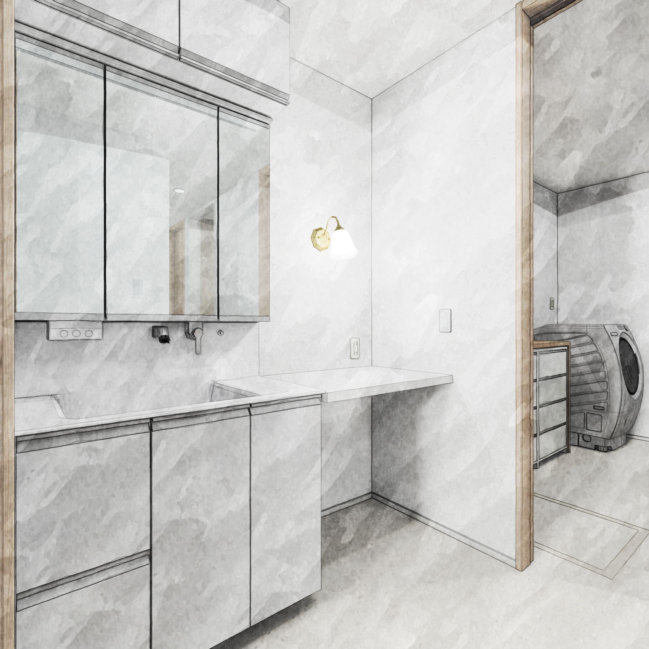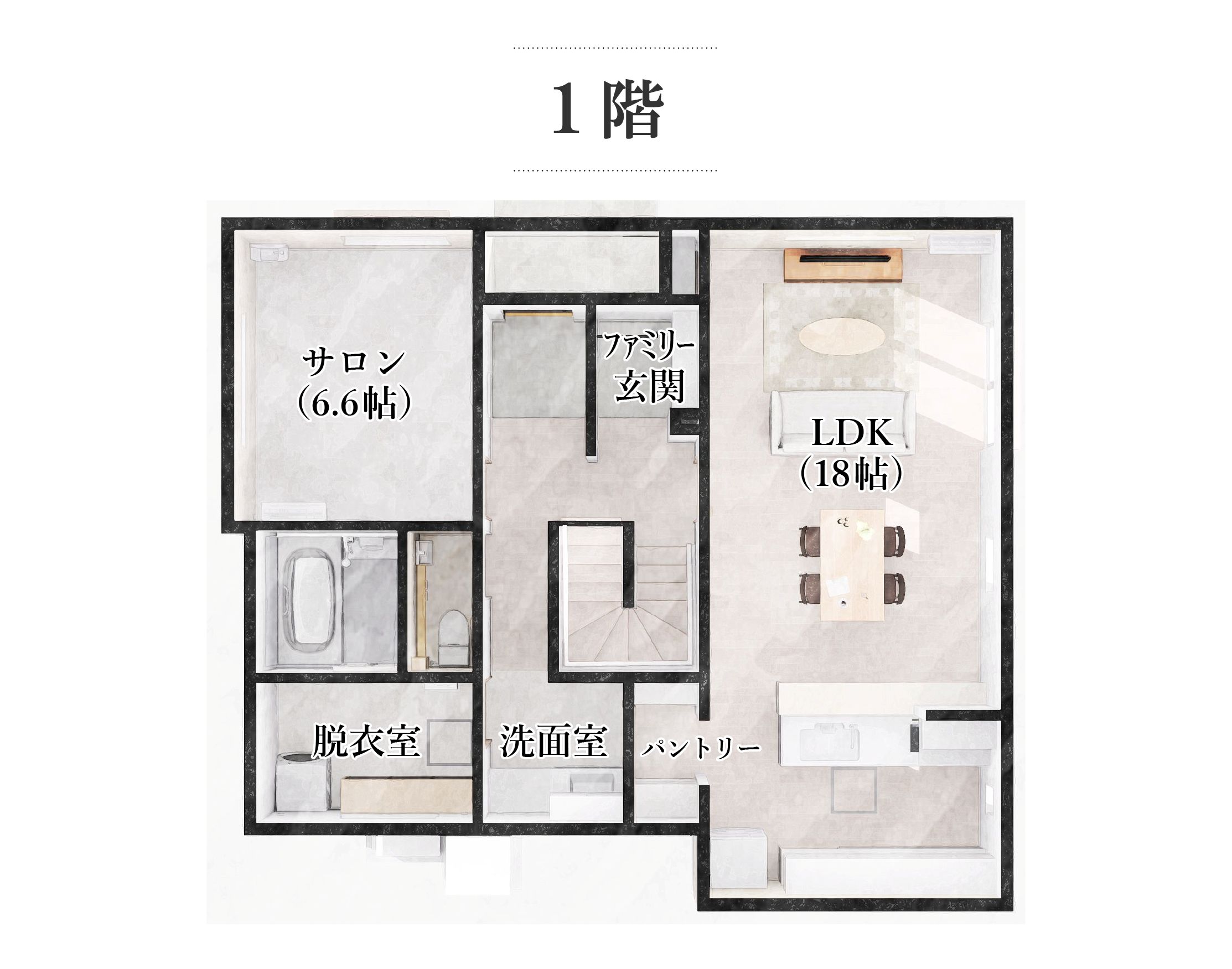 キッチンから洗⾯室・ランドリーへと⼀直線につながる動線とし、⽇々の家事がスムーズに⾏えるレイアウトとしました。また、帰宅後は⼿洗いを済ませてからパントリーを通りキッチンへとつながる動線を確保し、家事効率と衛⽣⾯の両⽅に配慮。さらに、階段下のデッドスペースを活⽤した収納をはじめ、2階各個室のクローゼットやキッチン前のカウンター収納など、住まいの随所に収納を計画。すっきりと暮らせる⼯夫を随所に取り⼊れています