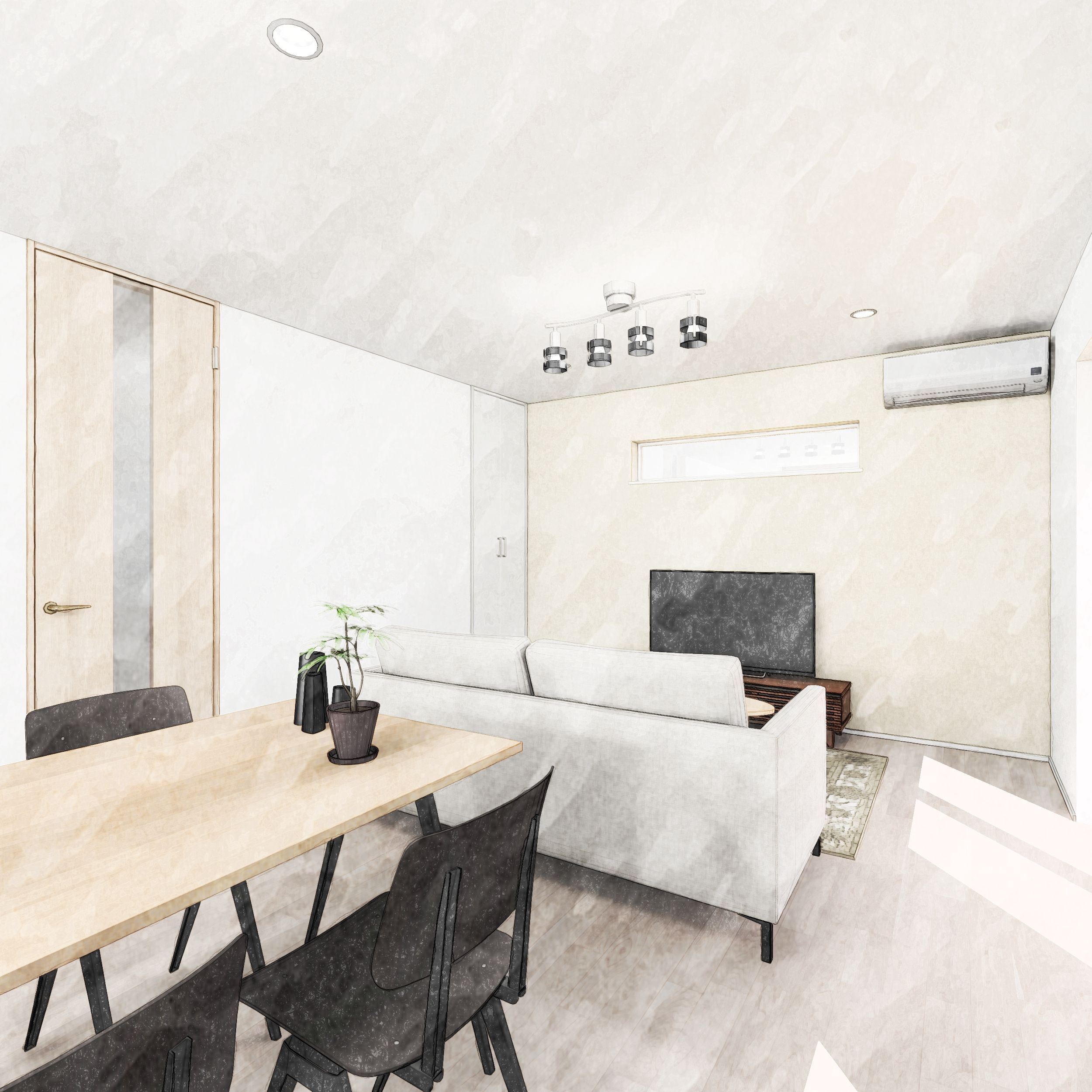 リビング、ダイニング、キッチンが一直線に並ぶI型LDKは視線が抜けダイニングやリビングの様子を見守ることができるので、見守りやすさ重視の子育て世帯におすすめです。リビングは、⼗分な採光を確保しながらも外からの視線に配慮した窓配置とし、明るさとプライバシーを両⽴しました。