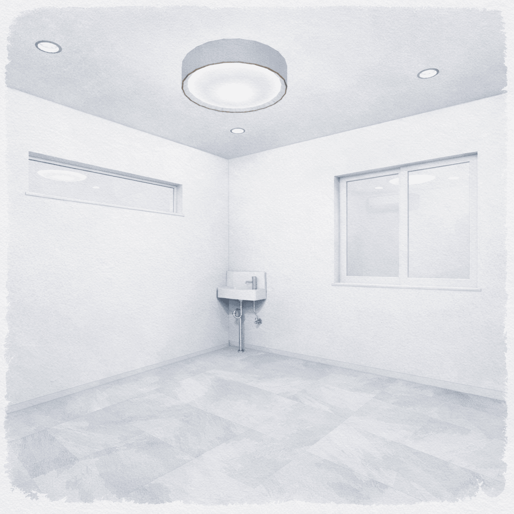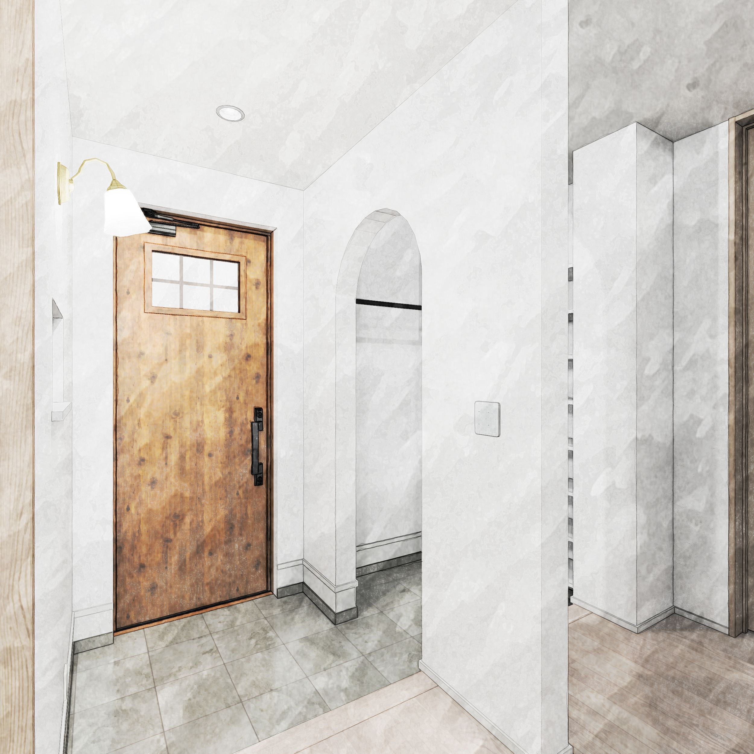 ⽞関を⼊ってすぐのお部屋は、将来のサロン開業を⾒据えた空間。⼿洗い設備も備えています。また来客⽤動線とは別にファミリー⽞関を設け、⽣活空間を通らずに来客をご案内できる計画です。