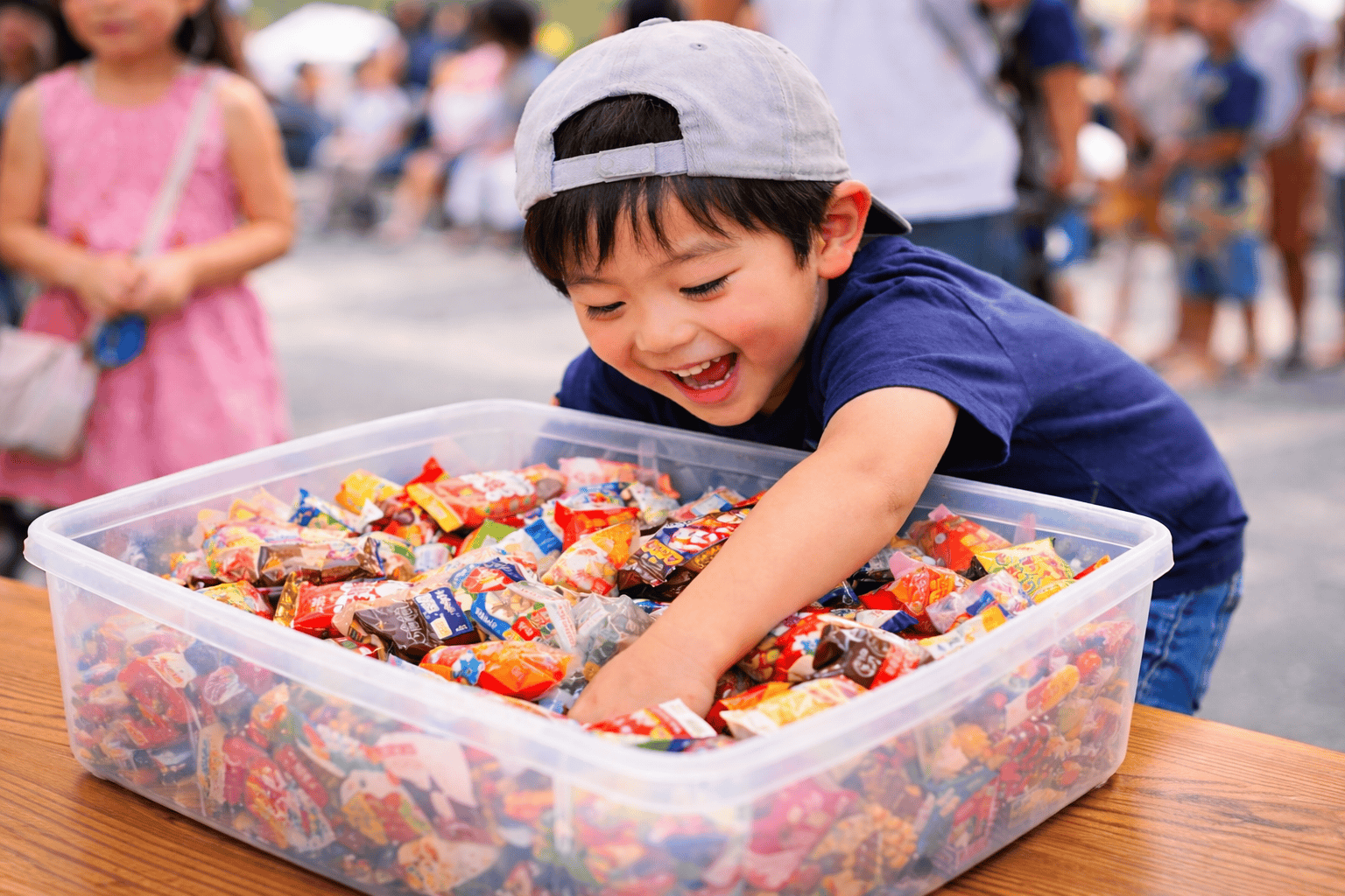 小学生以下のお子様にはお家の形をしたお菓子BOXプレゼント♪小学生以上のお子様にはお菓子つかみ取りに挑戦いただけます。大人の方にはバスボムつかみ取りをご用意!