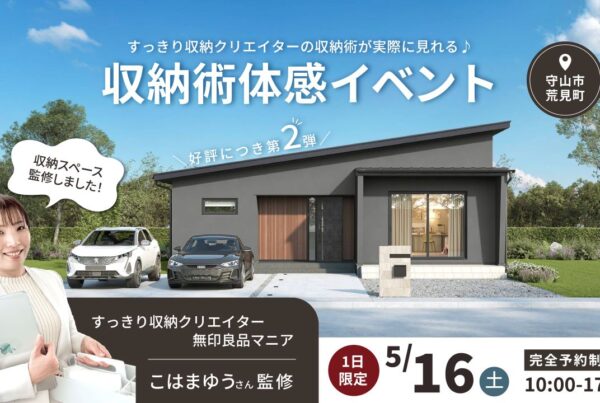 守山市荒見町に新しく完成した、サウナ付きの平屋モデルハウスにて、前回ご好評いただいたイベントの第2弾を開催いたします♪すっきり収納クリエイターで無印良品マニアの「こはまゆうさん」をお招きし、収納のポイントや実践的な収納術など、すぐに取り入れられるアイデアを直接見て・聞いていただける、特別なイベントです。1日限定の開催となりますので、ぜひお早めにご予約ください。